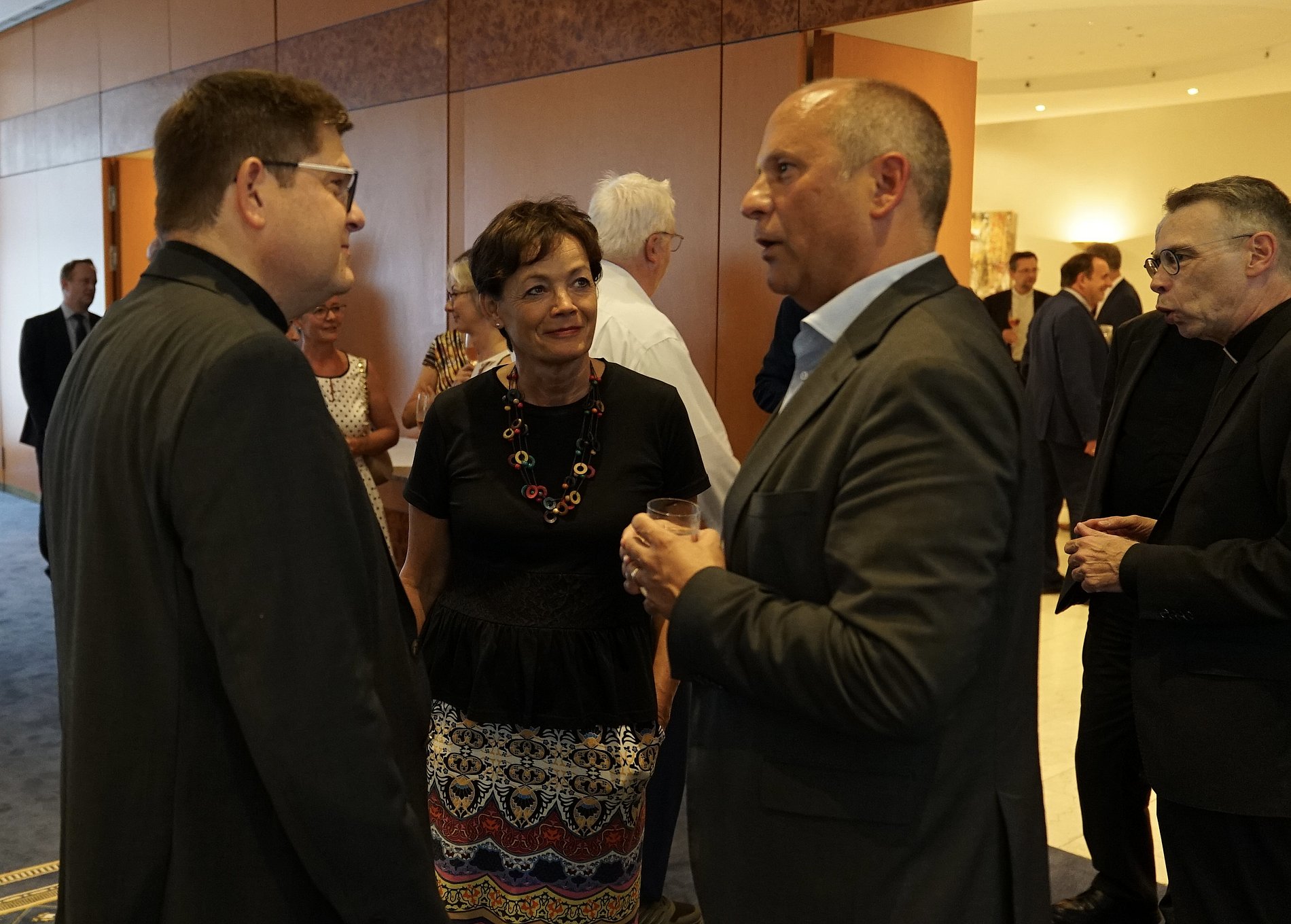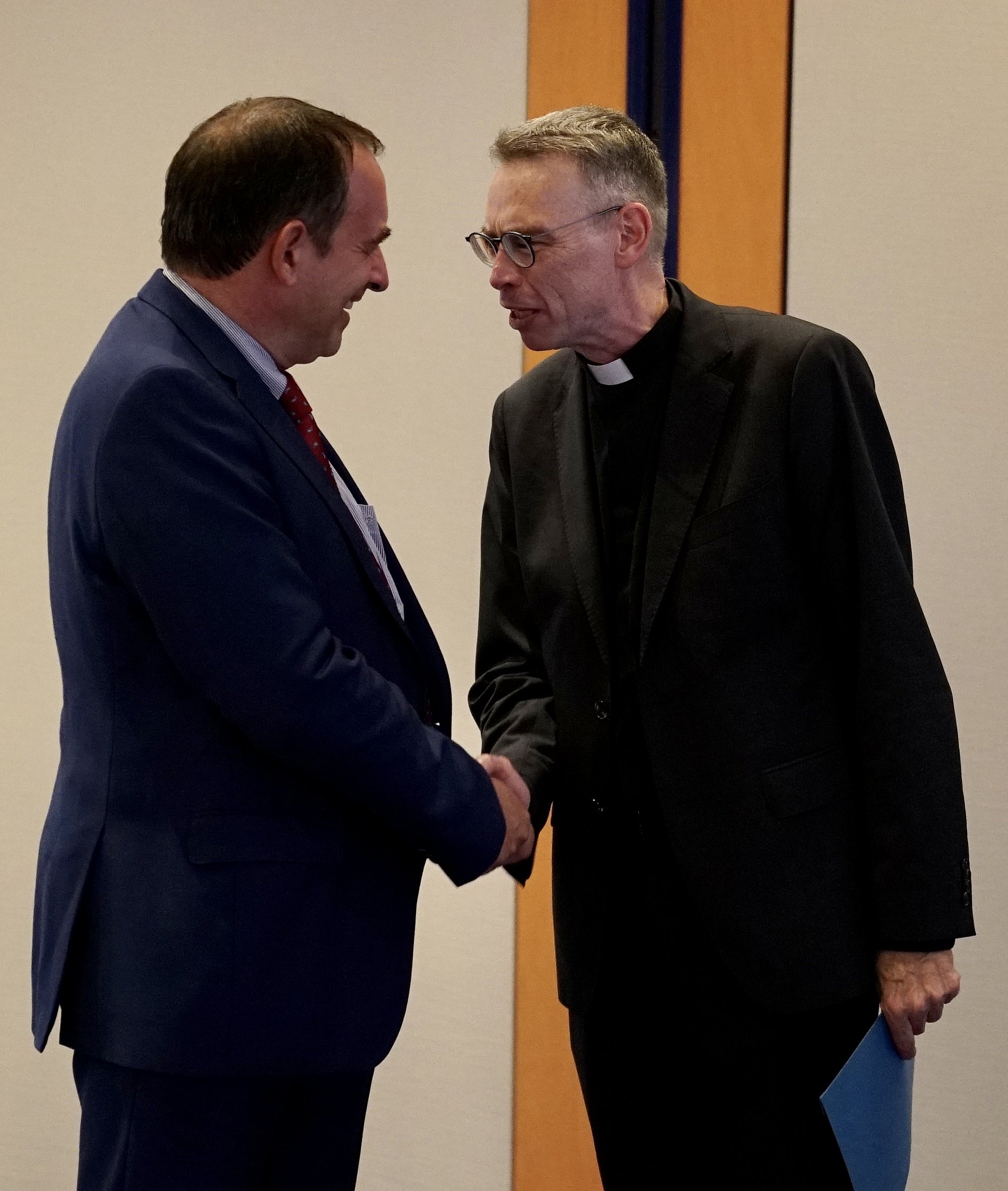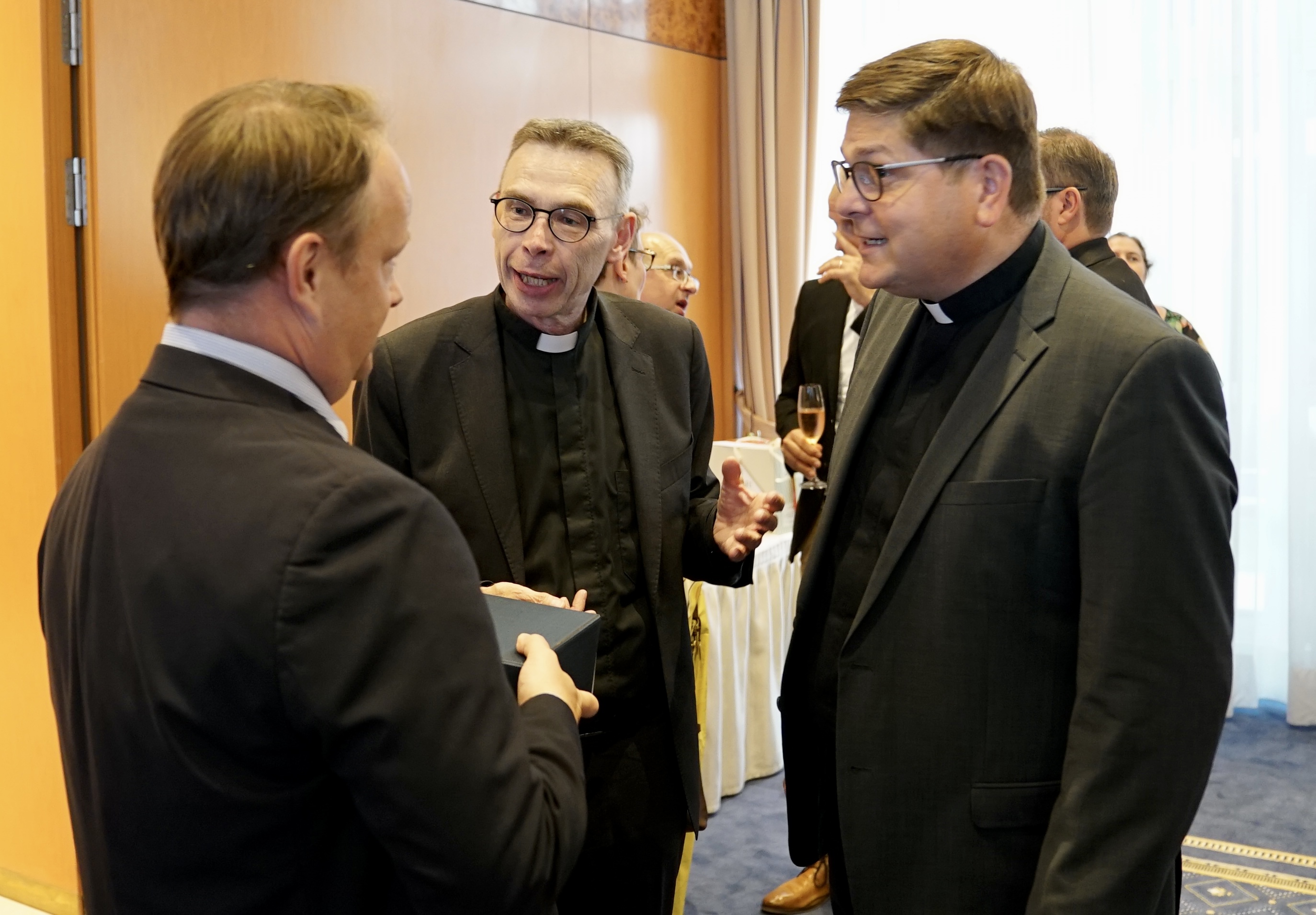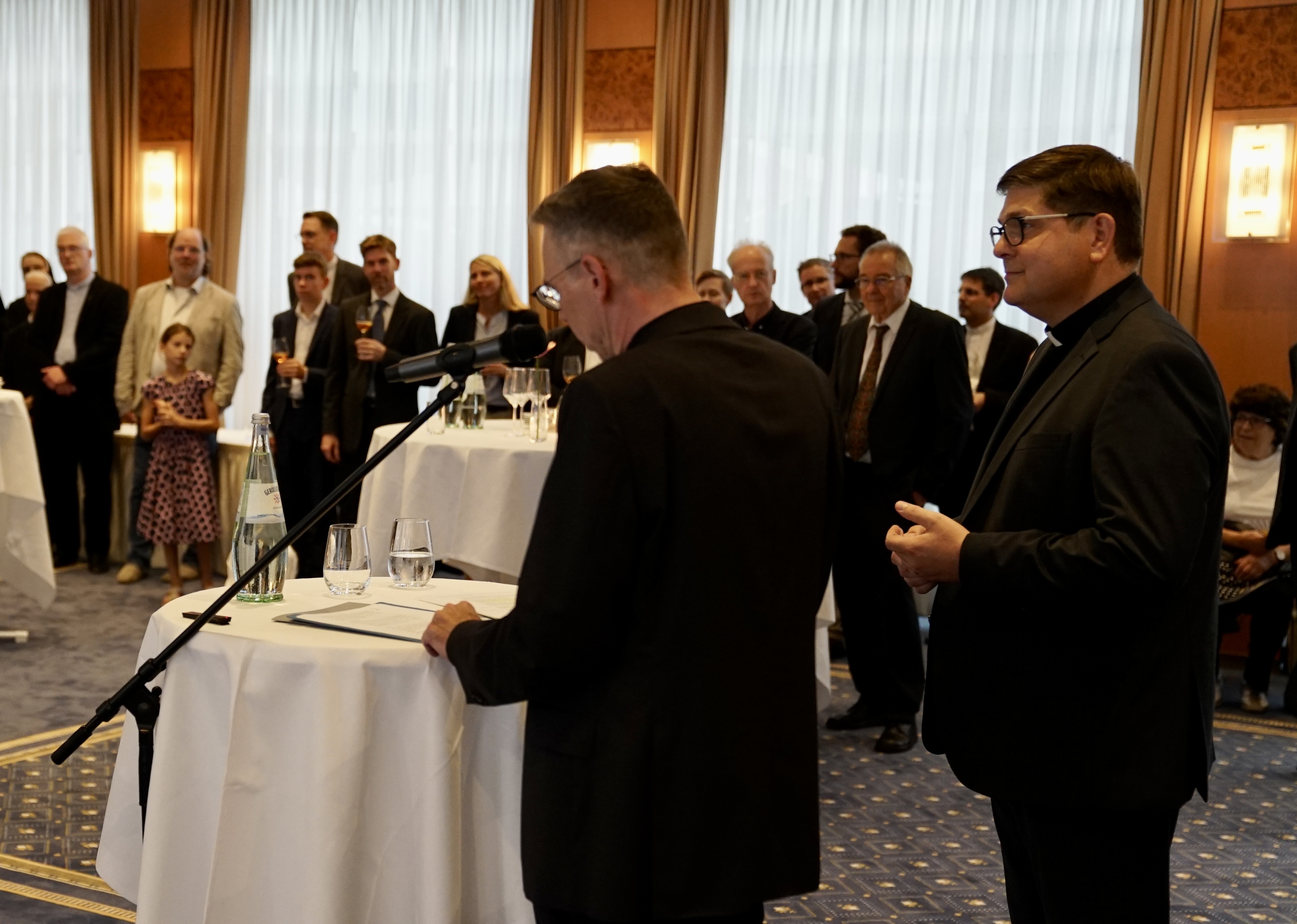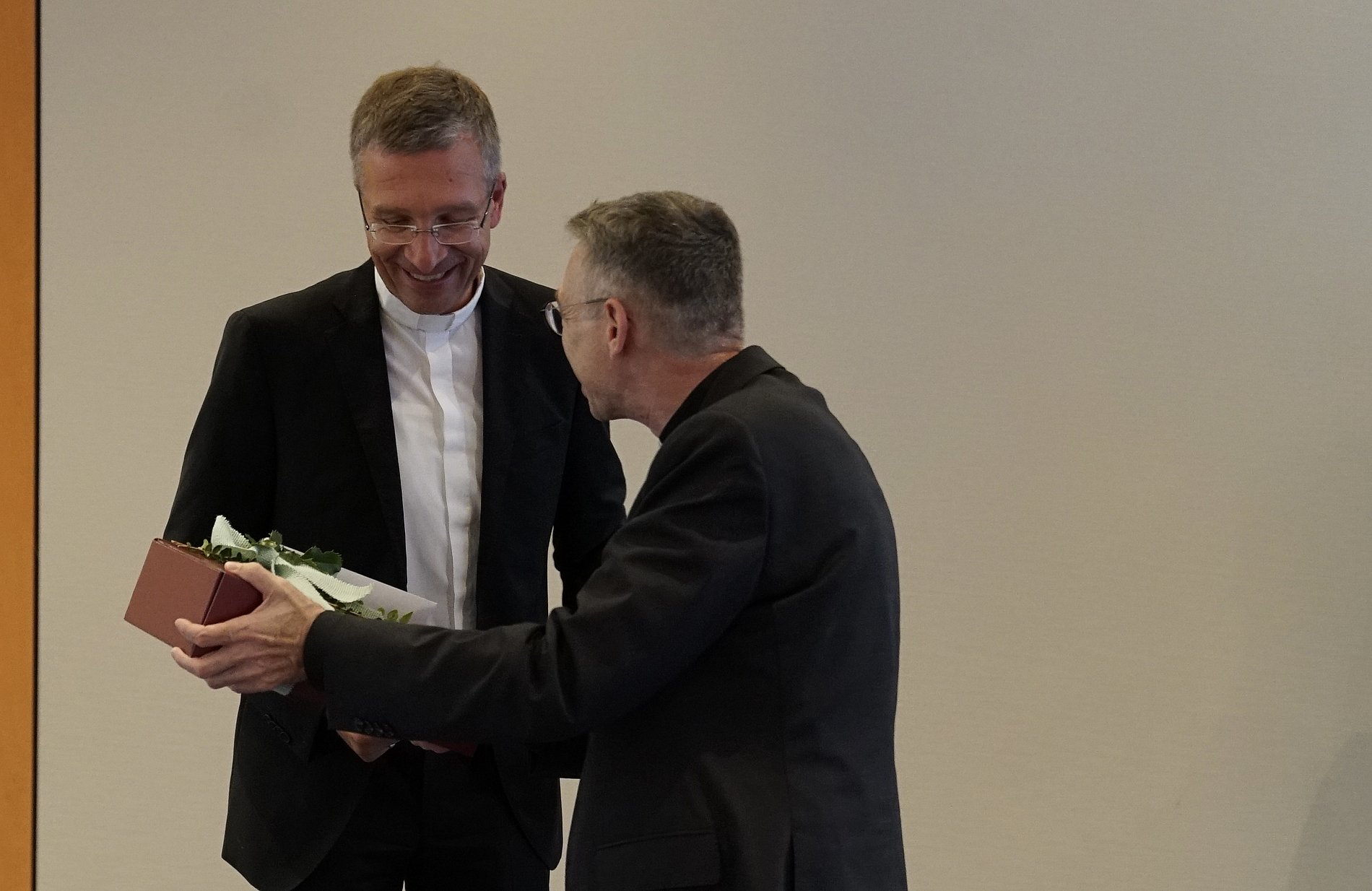 Lob für die Arbeit von Wolfgang Pax als Leiter des Kommissariats gab es auch von seinen Auftragsgebern, den hessischen Bischöfen. „Wir begehen heute hier mit der Staffelstabübergabe einen wichtigen Einschnitt“, sagte der Mainzer Bischof, Dr. Peter Kohlgraf. Sein Dienst als Bischof sei immer eng vom Kommissariat begleitet worden. „Ich habe die Arbeit des Kommissariats sehr, sehr schätzen gelernt. Es gibt viele Treffen und Gespräche mit Spitzenverbänden und der Politik. Das Kommissariat hat diese immer exzellent vorbereitet und durchgeführt. Vielen Dank dafür“, so Kohlgraf. Wolfgang Pax sei ein glaubwürdiges Gesicht von Kirche, einer Kirche, die sich in die Gesellschaft einbringen will. „Als Kirche wollen wir präsent sein. Wir wollen uns in Debatten einbringen und wollen unsere Stimme und unsere Werte in gesellschaftliche Kontexte einbringen. Diesen Willen sollten wir nicht kleinreden“, sagte der Bischof von Mainz. Kohlgraf überreichte Tonke Dennebaum die Ernennungsurkunde zum Leiter des Kommissariats. „Auf der Suche nach einem Nachfolger von Dr. Pax kamen Sie mir direkt in den Sinn. Das brachte mir zwar den Zorn mancher Mainzerinnen und Mainzer ein, weil Sie in der Bischofsstadt segensreich wirken, war aber unumgänglich“, so Kohlgraf. Dennebaum sei bestens auf die Aufgabe in Wiesbaden vorbereitet. Er habe mit Jugendlichen und jungen Menschen gearbeitet, sei ein guter Seelsorger und wissenschaftlich hoch qualifiziert. „Ich bin mir sicher, dass sie die Herzen und den Verstand der Menschen in Wiesbaden gewinnen werden und Mainz dabei nicht vergessen werden“, so Kohlgraf.