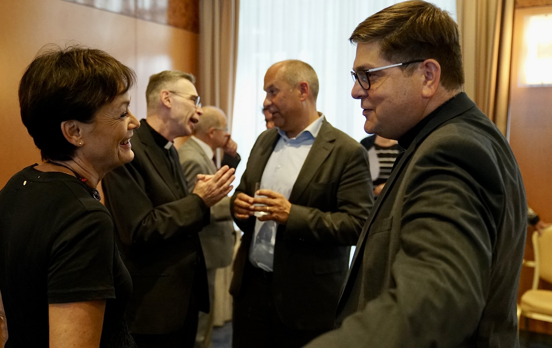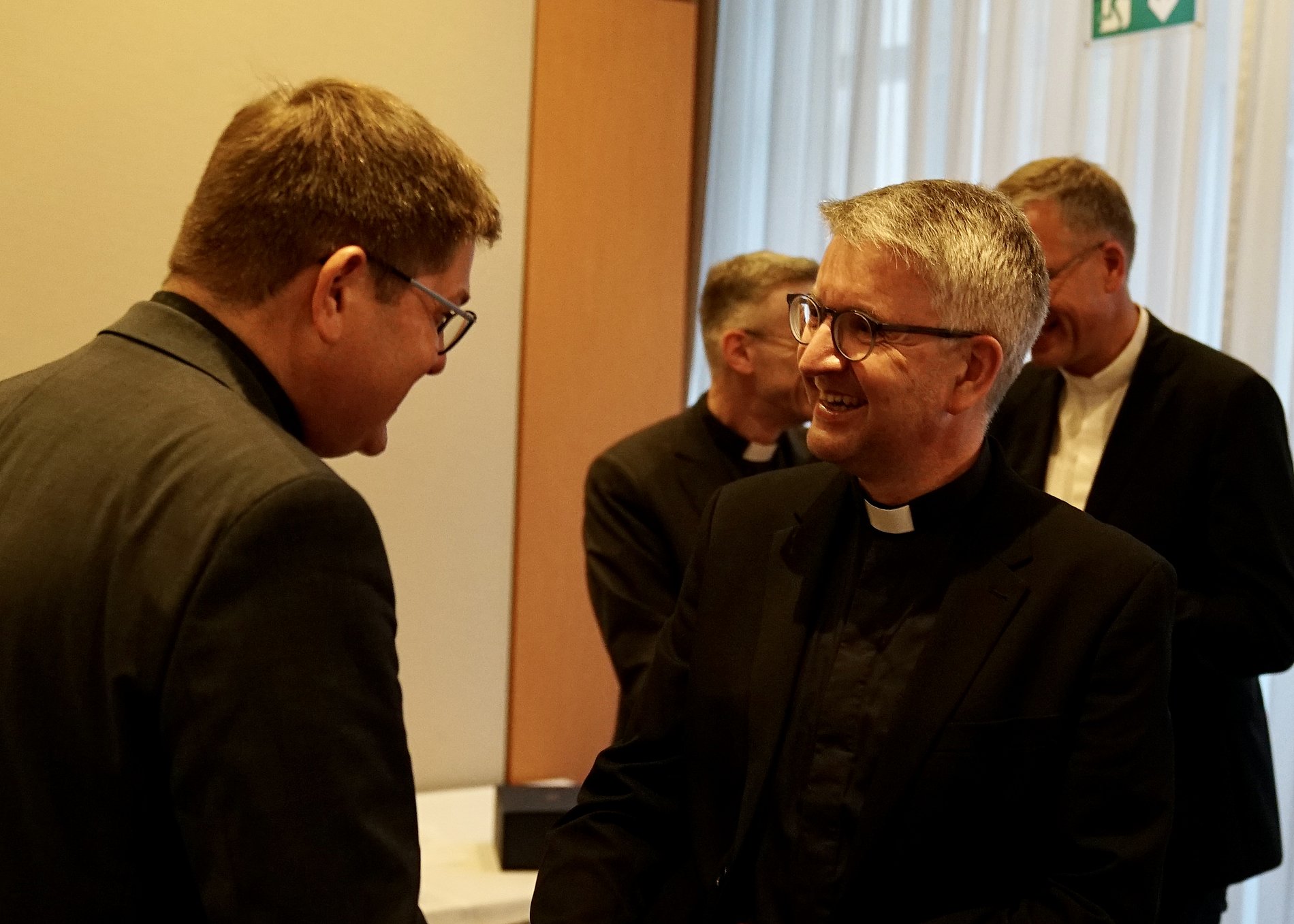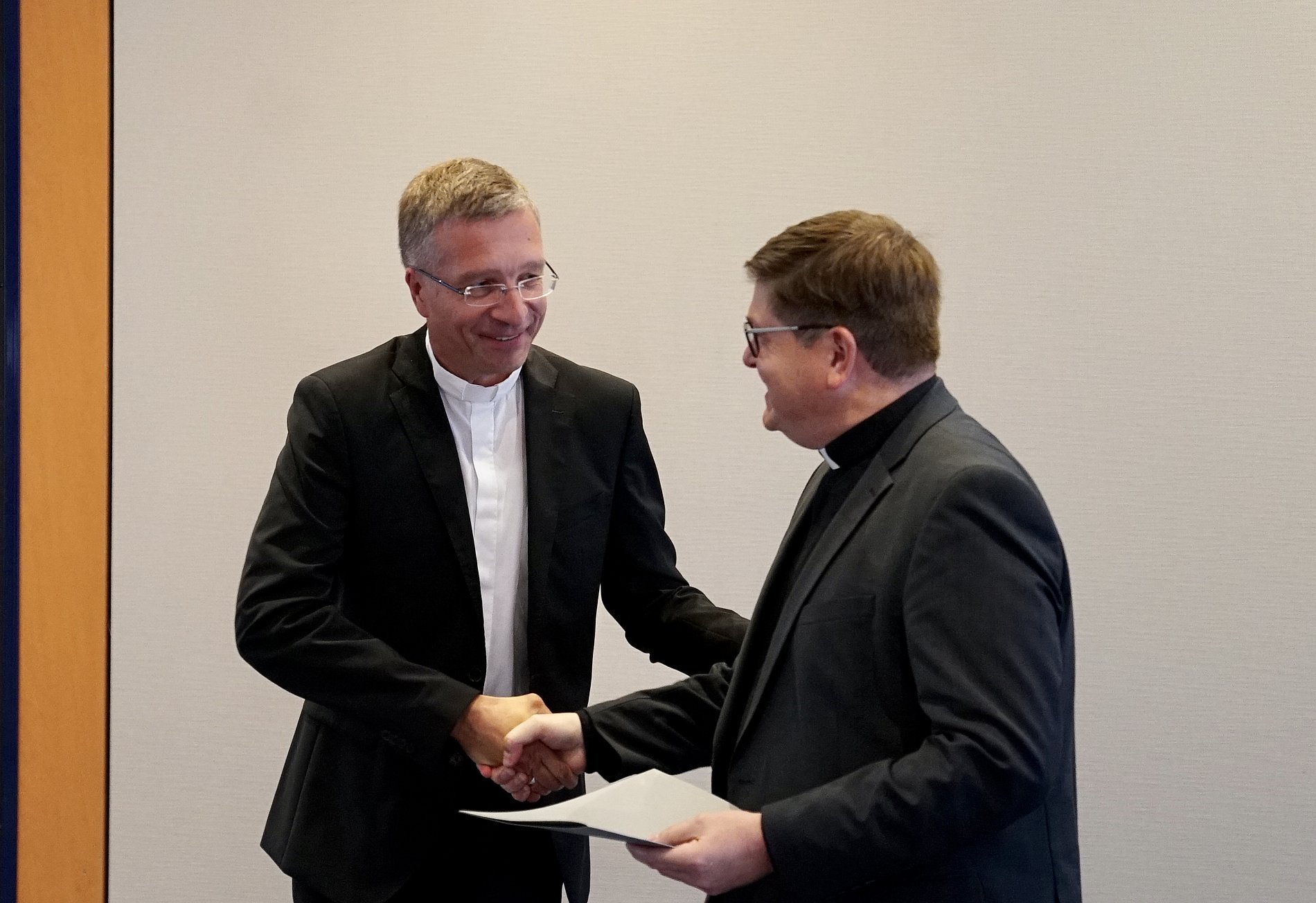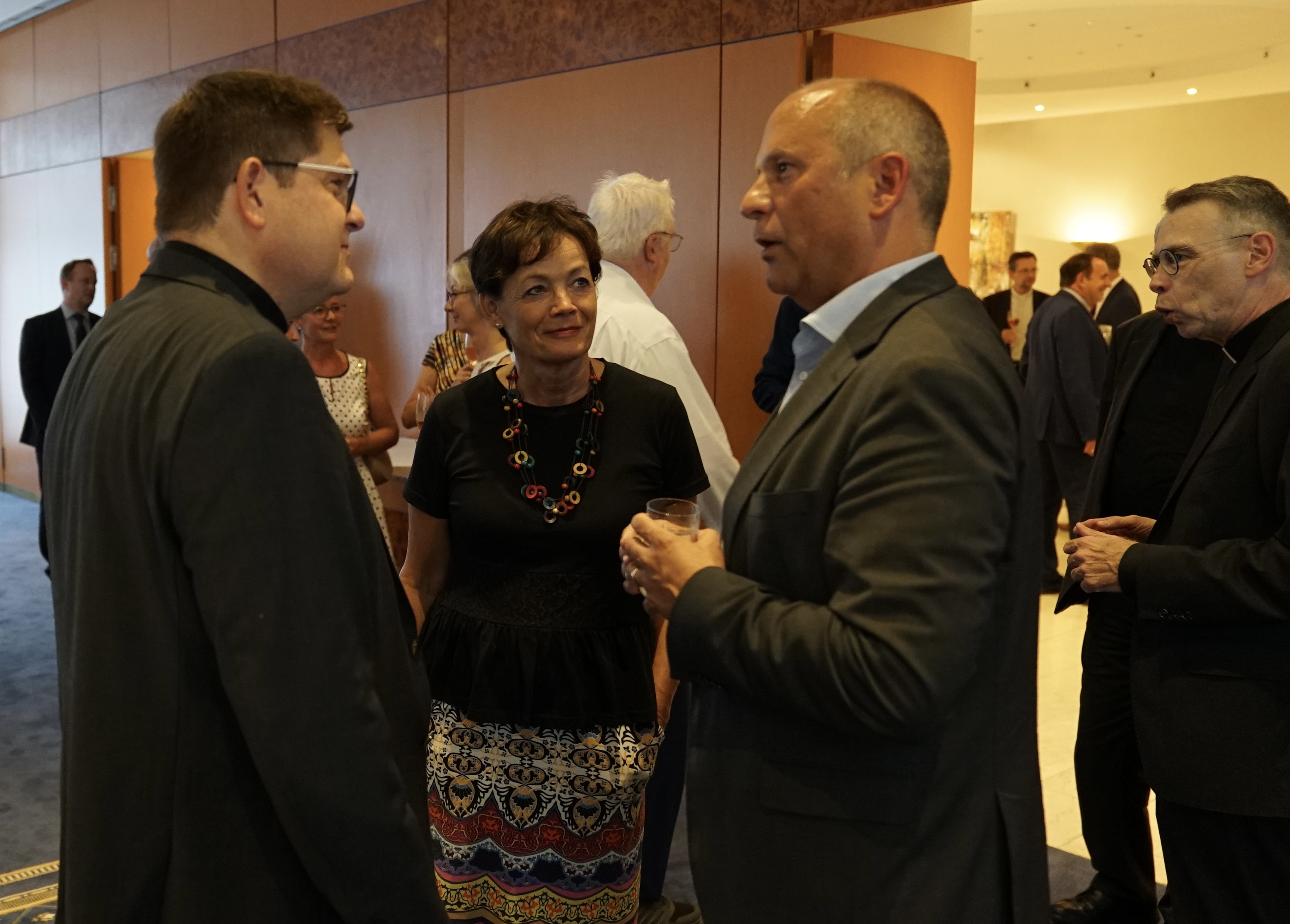 Lob für die Arbeit von Wolfgang Pax als Leiter des Kommissariats gab es auch von seinen Auftragsgebern, den hessischen Bischöfen. „Wir begehen heute hier mit der Staffelstabübergabe einen wichtigen Einschnitt“, sagte der Mainzer Bischof, Dr. Peter Kohlgraf. Sein Dienst als Bischof sei immer eng vom Kommissariat begleitet worden. „Ich habe die Arbeit des Kommissariats sehr, sehr schätzen gelernt. Es gibt viele Treffen und Gespräche mit Spitzenverbänden und der Politik. Das Kommissariat hat diese immer exzellent vorbereitet und durchgeführt. Vielen Dank dafür“, so Kohlgraf. Wolfgang Pax sei ein glaubwürdiges Gesicht von Kirche, einer Kirche, die sich in die Gesellschaft einbringen will. „Als Kirche wollen wir präsent sein. Wir wollen uns in Debatten einbringen und wollen unsere Stimme und unsere Werte in gesellschaftliche Kontexte einbringen. Diesen Willen sollten wir nicht kleinreden“, sagte der Bischof von Mainz. Kohlgraf überreichte Tonke Dennebaum die Ernennungsurkunde zum Leiter des Kommissariats. „Auf der Suche nach einem Nachfolger von Dr. Pax kamen Sie mir direkt in den Sinn. Das brachte mir zwar den Zorn mancher Mainzerinnen und Mainzer ein, weil Sie in der Bischofsstadt segensreich wirken, war aber unumgänglich“, so Kohlgraf. Dennebaum sei bestens auf die Aufgabe in Wiesbaden vorbereitet. Er habe mit Jugendlichen und jungen Menschen gearbeitet, sei ein guter Seelsorger und wissenschaftlich hoch qualifiziert. „Ich bin mir sicher, dass sie die Herzen und den Verstand der Menschen in Wiesbaden gewinnen werden und Mainz dabei nicht vergessen werden“, so Kohlgraf.
