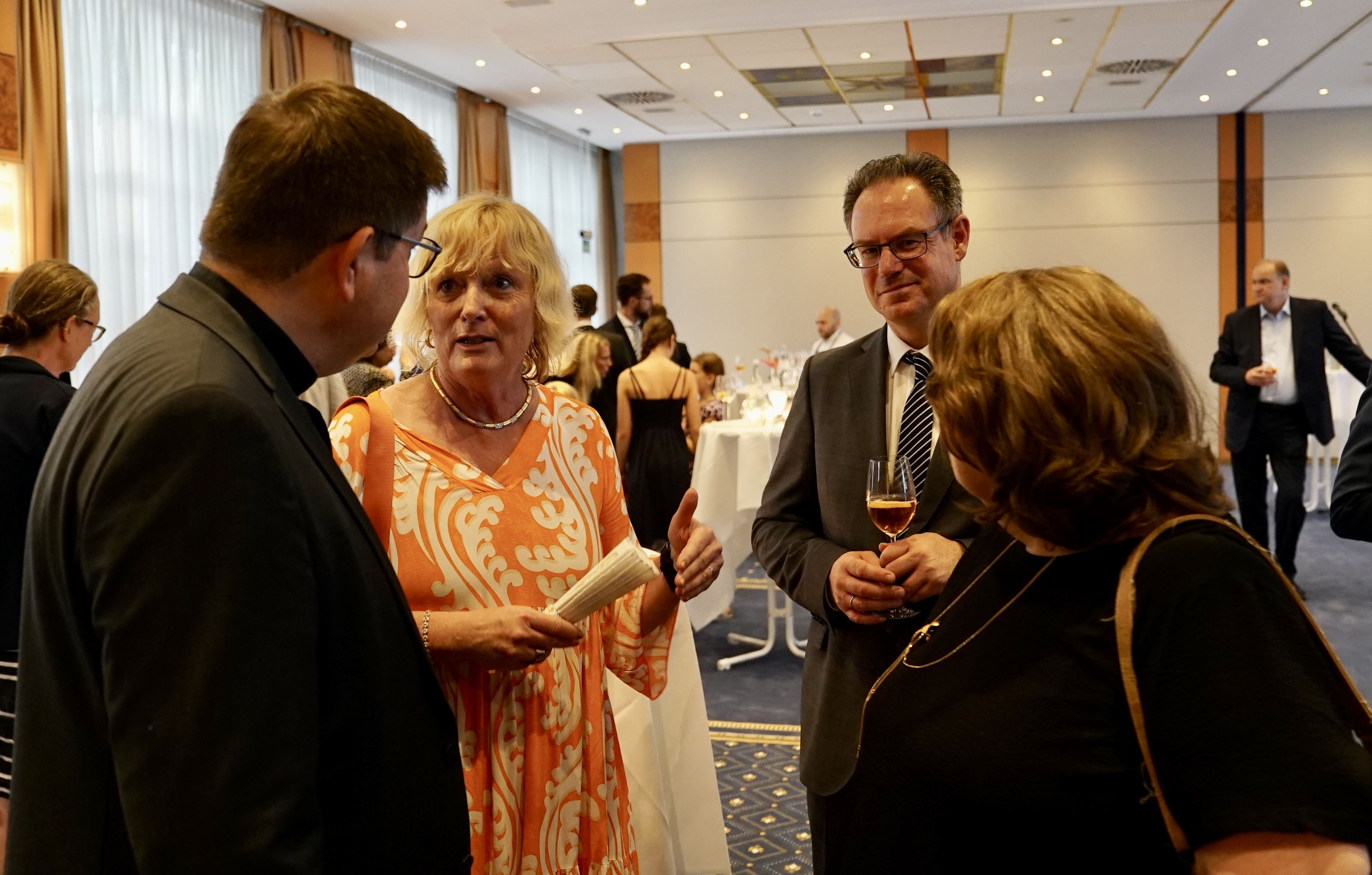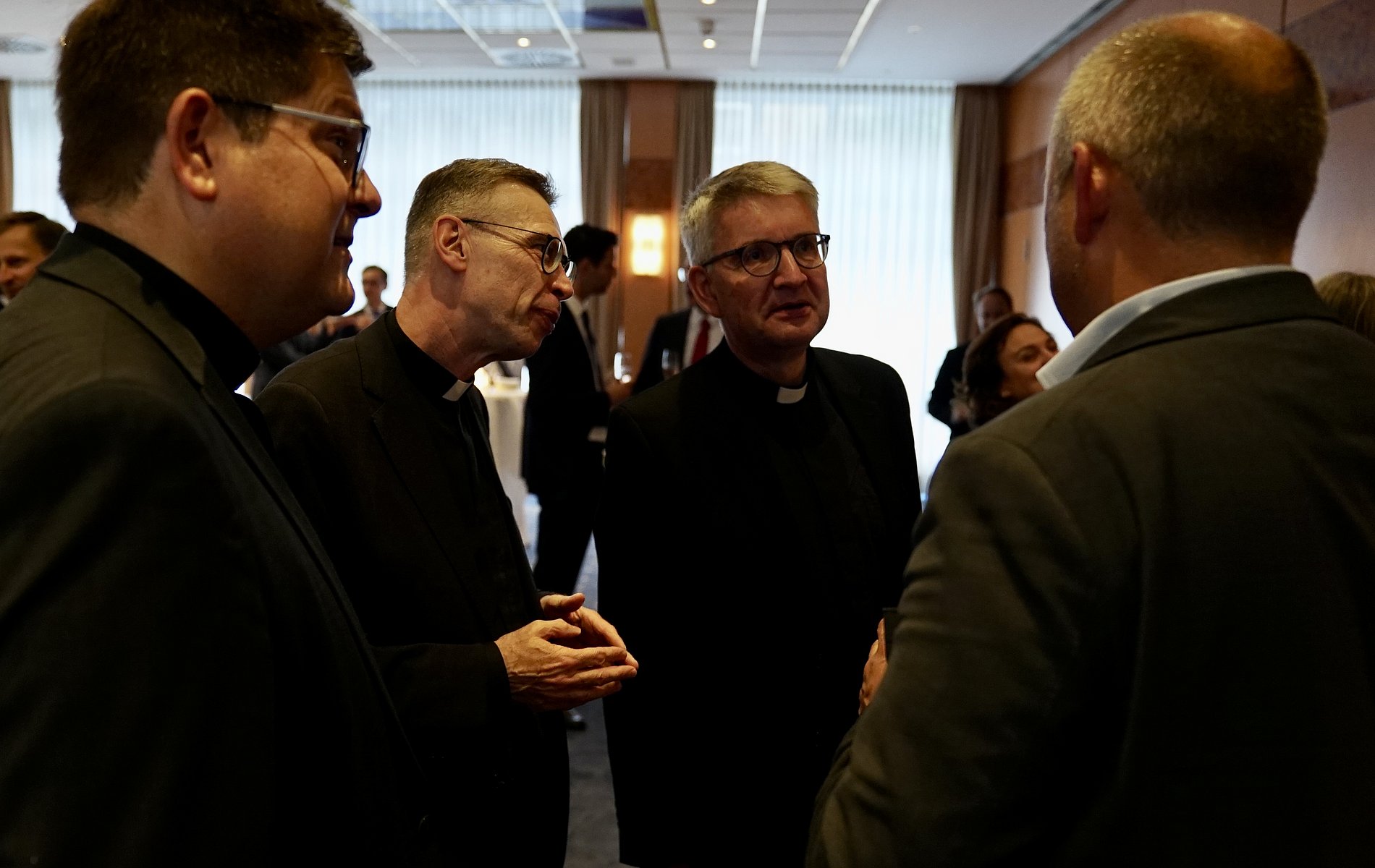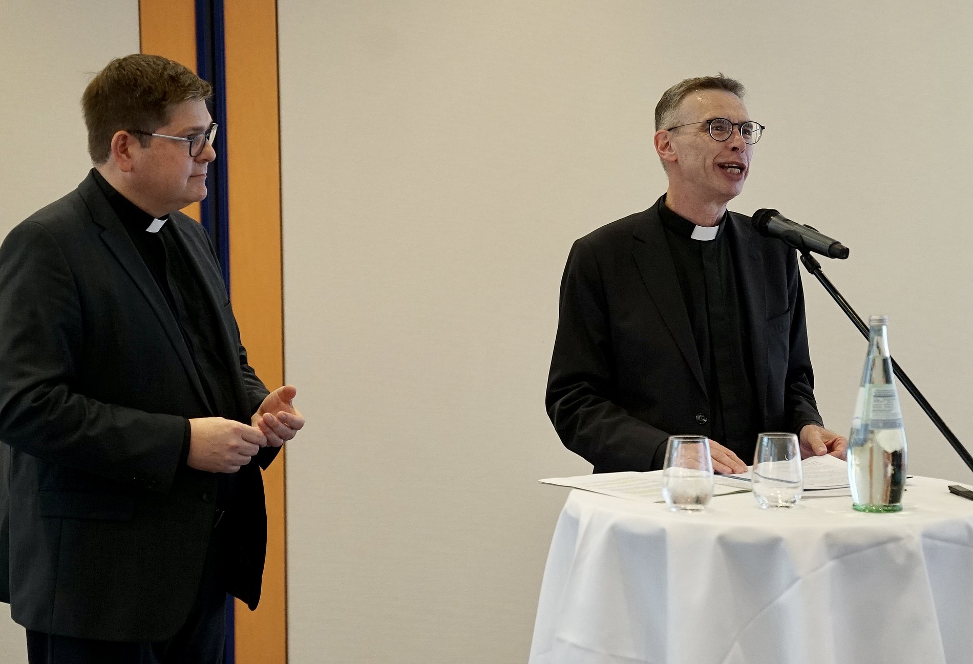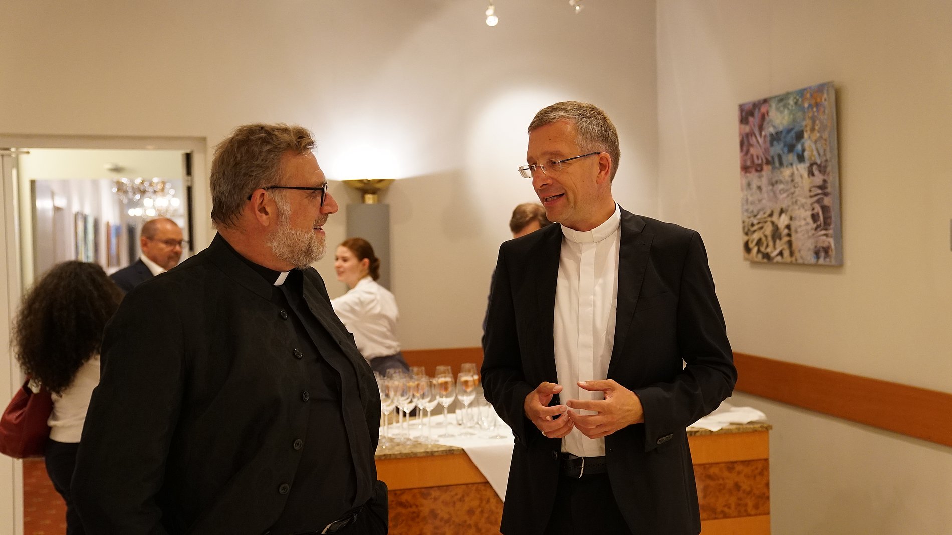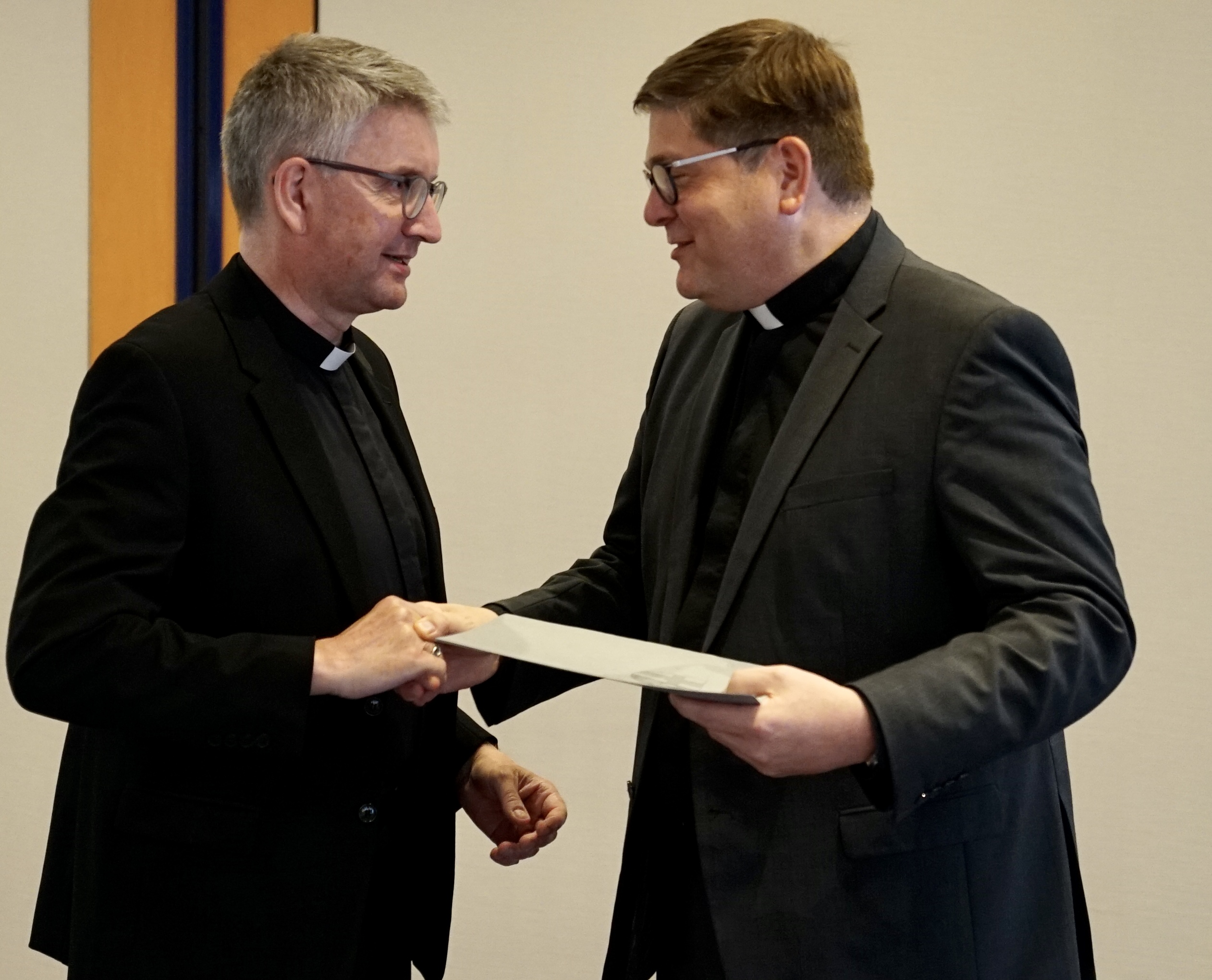 Lob für die Arbeit von Wolfgang Pax als Leiter des Kommissariats gab es auch von seinen Auftragsgebern, den hessischen Bischöfen. „Wir begehen heute hier mit der Staffelstabübergabe einen wichtigen Einschnitt“, sagte der Mainzer Bischof, Dr. Peter Kohlgraf. Sein Dienst als Bischof sei immer eng vom Kommissariat begleitet worden. „Ich habe die Arbeit des Kommissariats sehr, sehr schätzen gelernt. Es gibt viele Treffen und Gespräche mit Spitzenverbänden und der Politik. Das Kommissariat hat diese immer exzellent vorbereitet und durchgeführt. Vielen Dank dafür“, so Kohlgraf. Wolfgang Pax sei ein glaubwürdiges Gesicht von Kirche, einer Kirche, die sich in die Gesellschaft einbringen will. „Als Kirche wollen wir präsent sein. Wir wollen uns in Debatten einbringen und wollen unsere Stimme und unsere Werte in gesellschaftliche Kontexte einbringen. Diesen Willen sollten wir nicht kleinreden“, sagte der Bischof von Mainz. Kohlgraf überreichte Tonke Dennebaum die Ernennungsurkunde zum Leiter des Kommissariats. „Auf der Suche nach einem Nachfolger von Dr. Pax kamen Sie mir direkt in den Sinn. Das brachte mir zwar den Zorn mancher Mainzerinnen und Mainzer ein, weil Sie in der Bischofsstadt segensreich wirken, war aber unumgänglich“, so Kohlgraf. Dennebaum sei bestens auf die Aufgabe in Wiesbaden vorbereitet. Er habe mit Jugendlichen und jungen Menschen gearbeitet, sei ein guter Seelsorger und wissenschaftlich hoch qualifiziert. „Ich bin mir sicher, dass sie die Herzen und den Verstand der Menschen in Wiesbaden gewinnen werden und Mainz dabei nicht vergessen werden“, so Kohlgraf.