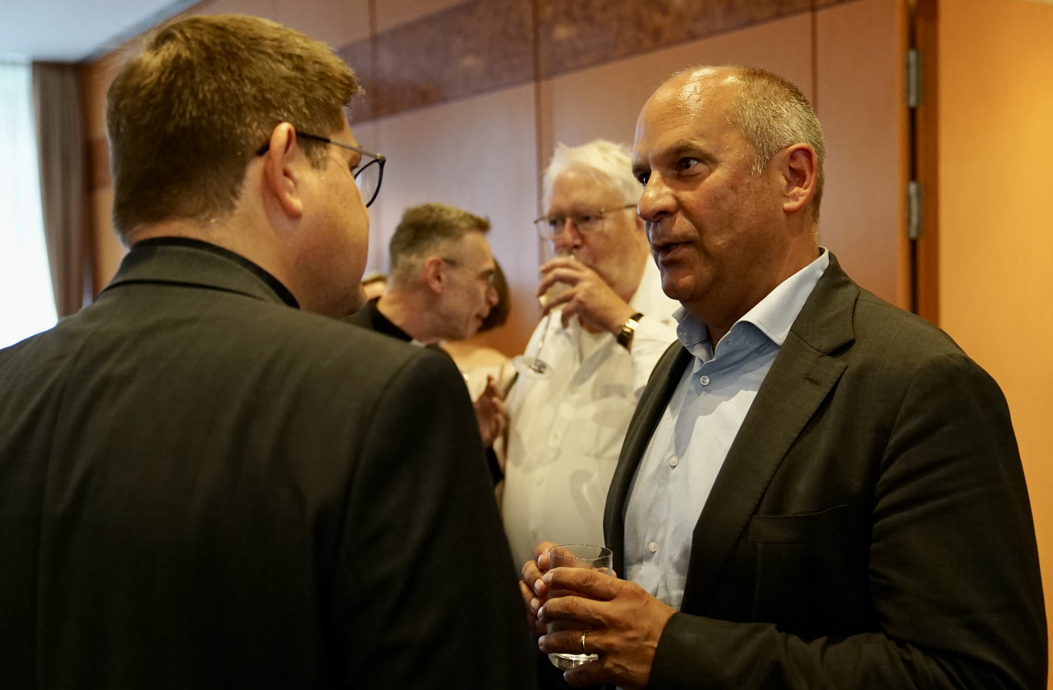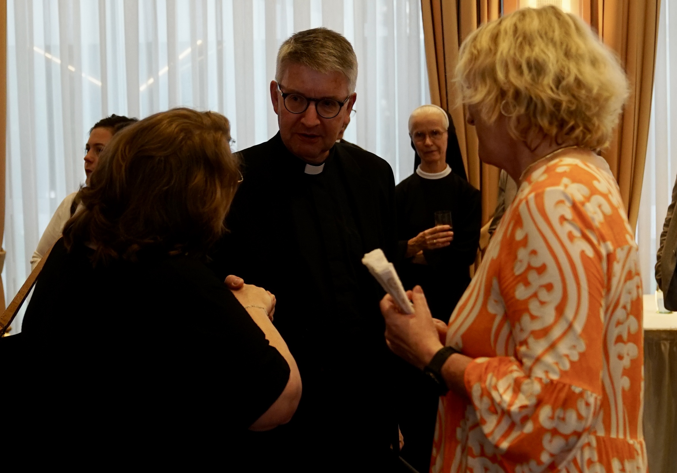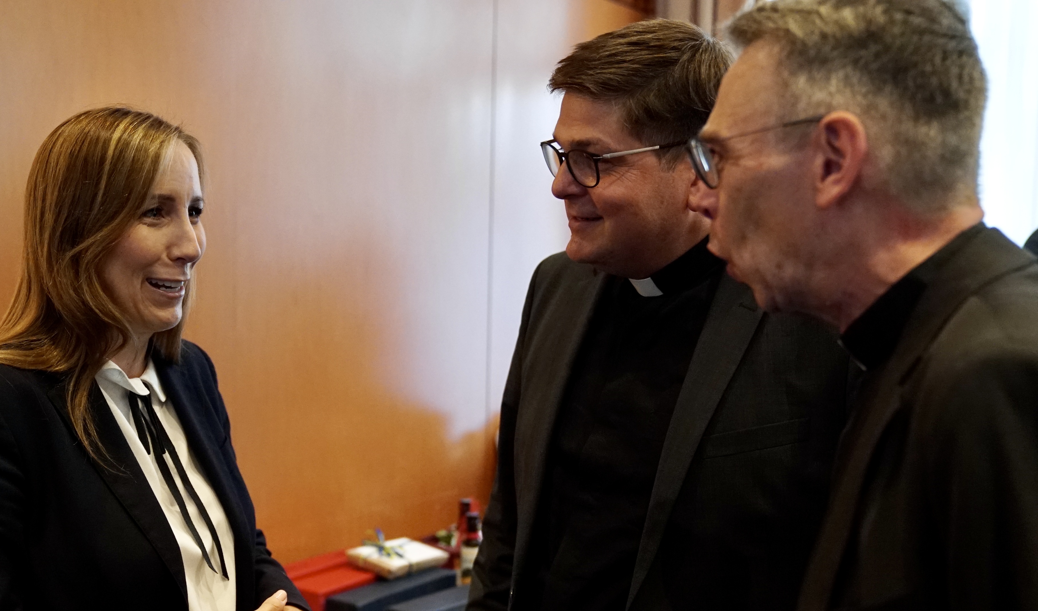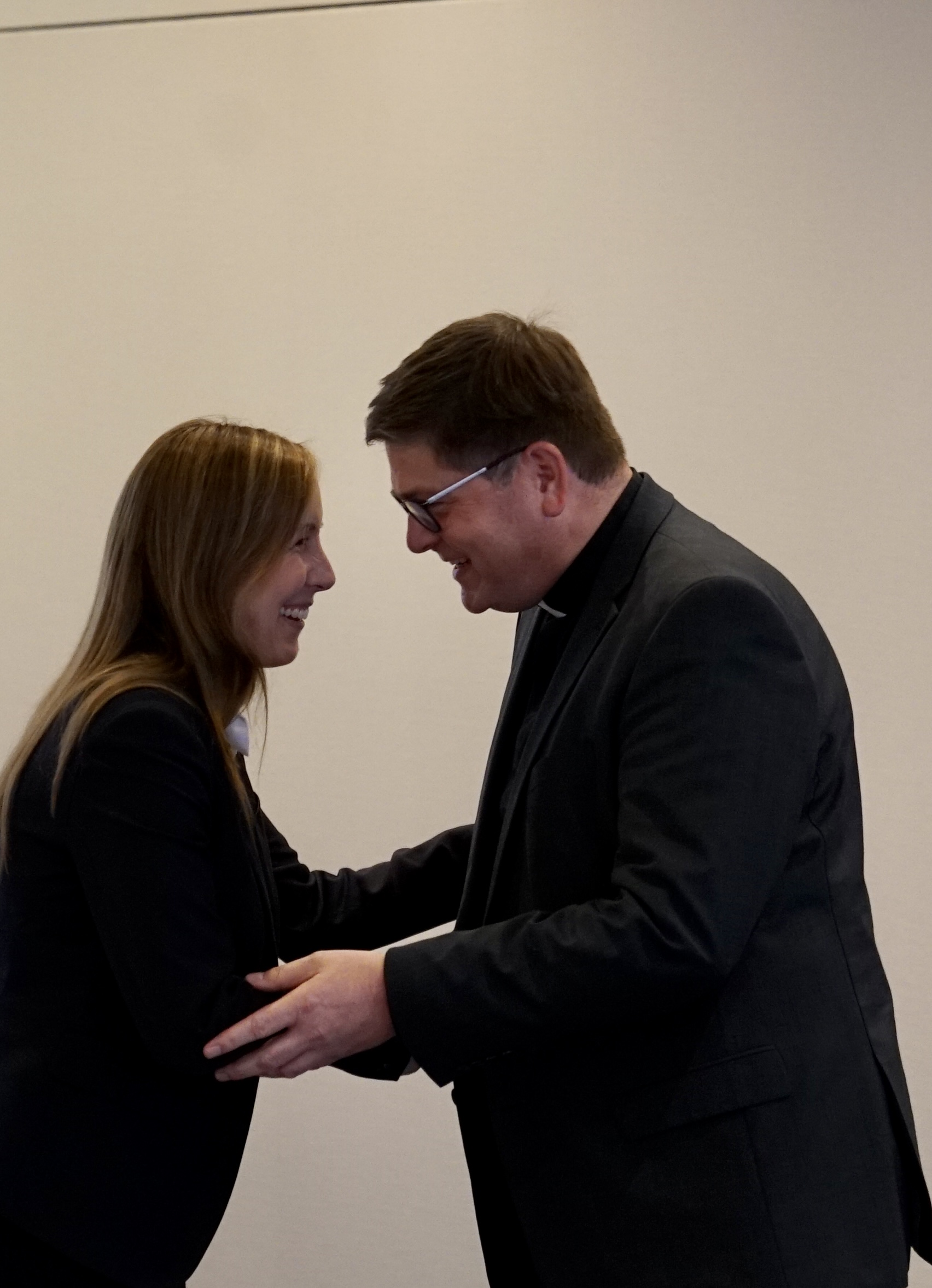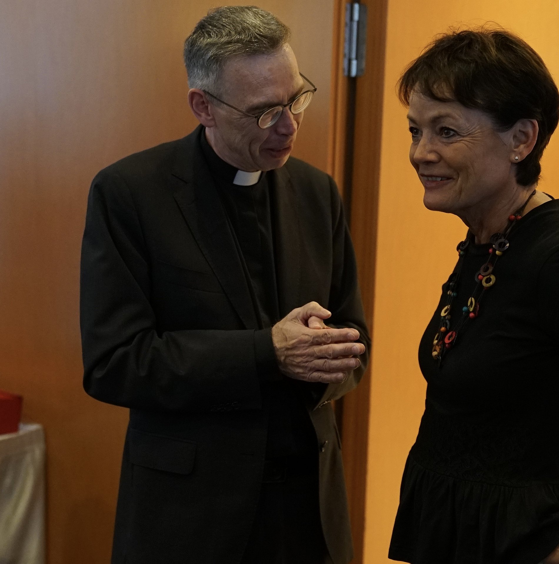 Lob für die Arbeit von Wolfgang Pax als Leiter des Kommissariats gab es auch von seinen Auftragsgebern, den hessischen Bischöfen. „Wir begehen heute hier mit der Staffelstabübergabe einen wichtigen Einschnitt“, sagte der Mainzer Bischof, Dr. Peter Kohlgraf. Sein Dienst als Bischof sei immer eng vom Kommissariat begleitet worden. „Ich habe die Arbeit des Kommissariats sehr, sehr schätzen gelernt. Es gibt viele Treffen und Gespräche mit Spitzenverbänden und der Politik. Das Kommissariat hat diese immer exzellent vorbereitet und durchgeführt. Vielen Dank dafür“, so Kohlgraf. Wolfgang Pax sei ein glaubwürdiges Gesicht von Kirche, einer Kirche, die sich in die Gesellschaft einbringen will. „Als Kirche wollen wir präsent sein. Wir wollen uns in Debatten einbringen und wollen unsere Stimme und unsere Werte in gesellschaftliche Kontexte einbringen. Diesen Willen sollten wir nicht kleinreden“, sagte der Bischof von Mainz. Kohlgraf überreichte Tonke Dennebaum die Ernennungsurkunde zum Leiter des Kommissariats. „Auf der Suche nach einem Nachfolger von Dr. Pax kamen Sie mir direkt in den Sinn. Das brachte mir zwar den Zorn mancher Mainzerinnen und Mainzer ein, weil Sie in der Bischofsstadt segensreich wirken, war aber unumgänglich“, so Kohlgraf. Dennebaum sei bestens auf die Aufgabe in Wiesbaden vorbereitet. Er habe mit Jugendlichen und jungen Menschen gearbeitet, sei ein guter Seelsorger und wissenschaftlich hoch qualifiziert. „Ich bin mir sicher, dass sie die Herzen und den Verstand der Menschen in Wiesbaden gewinnen werden und Mainz dabei nicht vergessen werden“, so Kohlgraf.