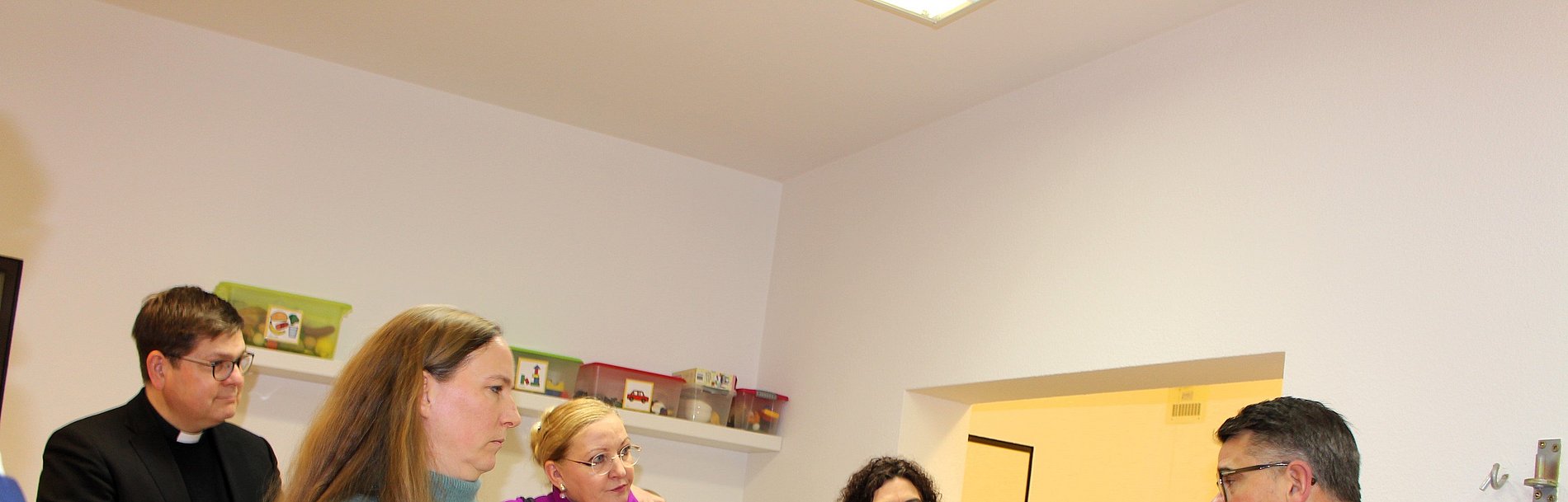 Sowohl beim Rundgang mit Diözesan-Caritasdirektorin Regina Freisberg, Pfarrer Dr. Tonke Dennebaum, Leiter des Kommissariats der katholischen Bischöfe in Hessen und Caritasdirektorin Stefanie Rhein durch die Beratungs- und Therapieräume der Logopädie, Ergo- und Physiotherapie als auch beim Gespräch mit zwei Müttern, einem Vater und einem ehemaligen Frühförderkind, kam es zum Austausch über viele aktuelle Themen. Da gibt es den Fachkräftemangel im medizinisch-therapeutischen Bereich, die langen Wartezeiten auf das Angebot, die Verschlechterung der Inklusion bis hin zum Ausschluss von Kindern mit Behinderung in der KiTa vor dem Hintergrund des Fachkräftemangels. Themen waren auch die knappen Ressourcen im Hilfesystem frühkindlicher Entwicklung, ob Diagnostik, Therapieplätze oder kinderärztliche Versorgung. Die Anfragen von Familien mit Flucht-Hintergrund steigen ebenso wie die Anmeldungen von Kindern mit Verdachtsdiagnosen Autismus-Spektrum-Störung oder Interaktionsstörungen. Dass das Hilfsangebot mit Schuleintritt endet, zu einer Zeit mit vielen Fragen, Unklarheiten und Unsicherheiten, zu der sich Eltern und Kinder einen begleiteten Übergang wünschen würden, ist schon lange ein Thema. Ideen der Umsetzung sind auch bereits vorhanden.